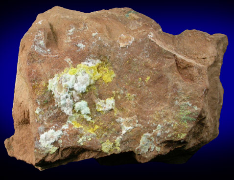 | Description: | Several patches of bright yellow needle-like blatonite crystals on brown matrix with a greenish-white mineral, possibly antlerite. |