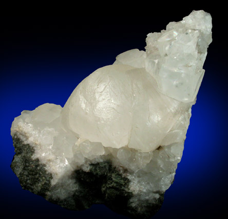 | Description: | Translucent-to transparent colorless rhombohedral calcite crystals in parallel orientation on greenish basalt. Ex. John Geiges collection #121 |