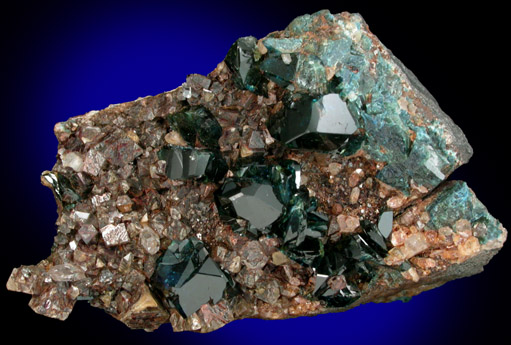 | Description: | Large lustrous dark blue-green lazulite crystals to 8 mm with rhombohedral brown siderite crystals to 2 mm. The lazulite crystals are transparent. Ex. John Geiges collection #123 |