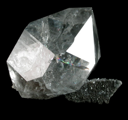 | Description: | Internally fractured Herkimer Diamond, the variety of transparent quartz crystal from the region around Herkimer, New York, with clean and lustrous crystal faces and dark phantom zone in the core. Fragment of gray dolostone is included in the bottom. |