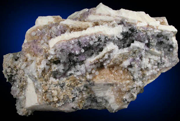 | Description: | Sparkling cluster of lustrous light-purple fluorapatite crystals to 2 mm with lustrous transparent colorless quartz crystals to 2 mm with black unknown mineral in cavities running through albite. |
