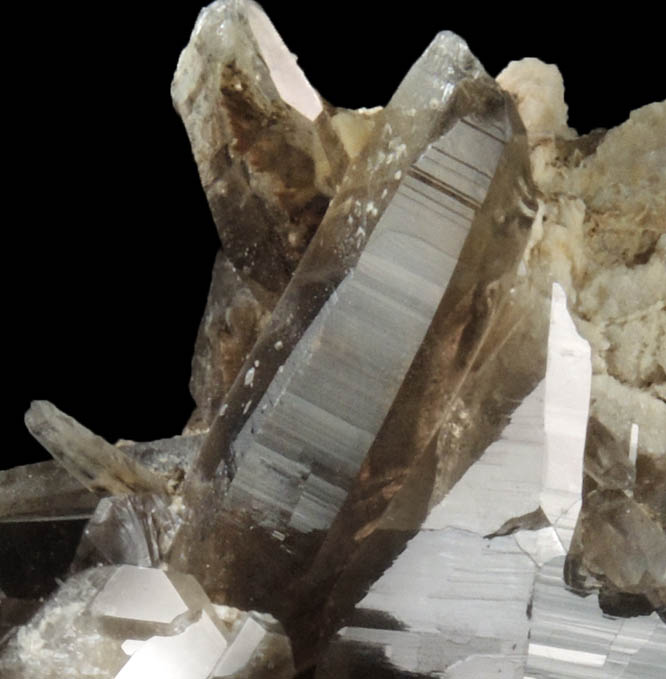 | Description: | Many lustrous transparent smoky quartz crystals on white albite cavity wall. The smaller smoky quartz crystals are complete and undamaged. The largest smoky quartz crystal terminated contacting another quartz crystal resulting in micro crystal faces. Collected ca. 1982 by Peter Samuelson |