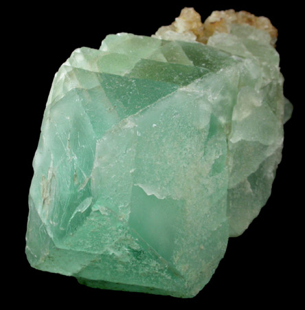 | Description: | Transparent-to-translucent green octahedral fluorite crystal overgrown on a small fragment of limonite-stained quartz crystals to 4 mm. The fluorite has etched surfaces and fluoresces under UV. This mine has not produced many specimens in recent years. |