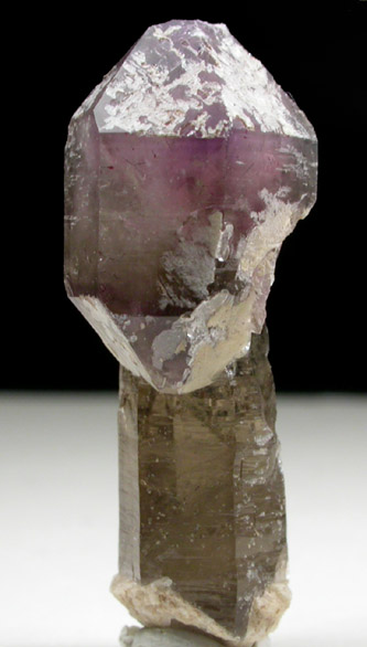 | Description: | Scepter-shaped formation of a 15 mm long transparent smoky quartz stem topped with a larger 15 mm transparent-to-translucent purple amethyst crystal. Subsurface whitish muscovite crystals are included in the outermost layers of the amethyst cap. Collected ca. 1988 |