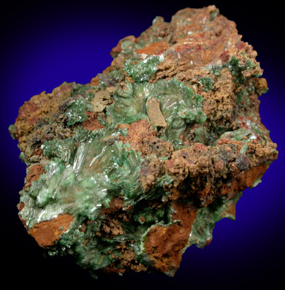 | Description: | Prismatic lustrous transparent green adamite crystals in fan-shaped formation in brown limonite gossan. The green color is due to copper impurities in the adamite often labeled with the obsolete name of cuproadamite or cuprian adamite. |