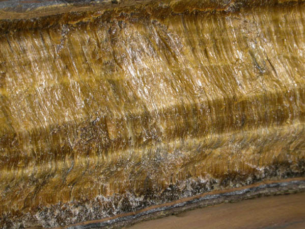 | Description: | Large vein of tiger-eye with bands of golden color caused by quartz pseudomorphs after fibrous riebeckite-crocidolite crystals with wavy, chatoyant reflections and luster. Large specimens like this have many lapidary uses for carving and jewelry. |