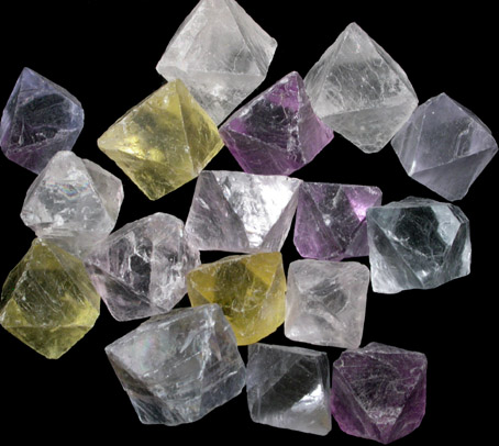 | Description: | Seventeen octahedral fluorite cleavages in various colors: colorless, purple, blue and yellow. |