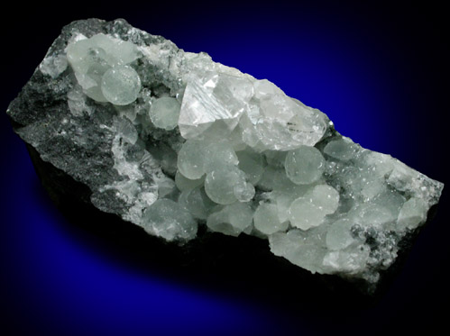 | Description: | Transparent green prehnite crystals in spherical aggregates to 5 mm diameter with transparent colorless rhombohedral calcite crystals to 8 mm. The surfaces of the prehnite aggregates are covered with distinct crystals faces that look beautiful under 20x. Collected ca. 1997. |