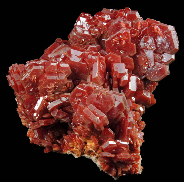 | Description: | Lustrous translucent red vanadinite crystals on brown matrix. The vanadinite crystals are hexagonal form with beveled {110} edge faces. The crystal faces oriented towards the rear have brown color due to subsurface inclusions. Collected in 2011 |