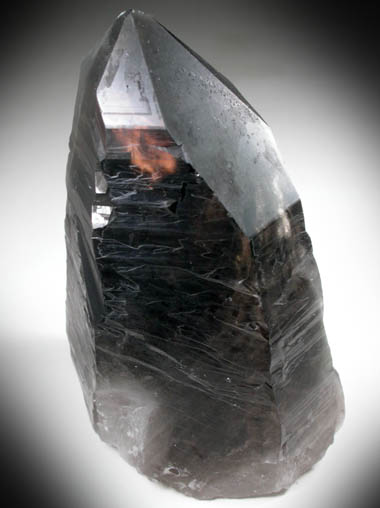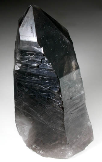| Description: | Transparent dark-smoky quartz crystals with complexly striated crystal faces that give the quartz a satin luster. The unusual elongates S-faces face {2111} on all corners indicate the crystal is twinned following the Dauphine Law of quartz twinning. |
