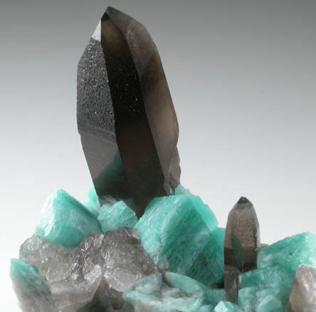| Description: | Two transparent smoky quartz crystals to 30 mm long standing upright off blue-green amazonite crystals, the variety of microcline feldspar colored by trace lead impurities to 10 mm. The tip of the largest smoky quartz crystals is chipped. |