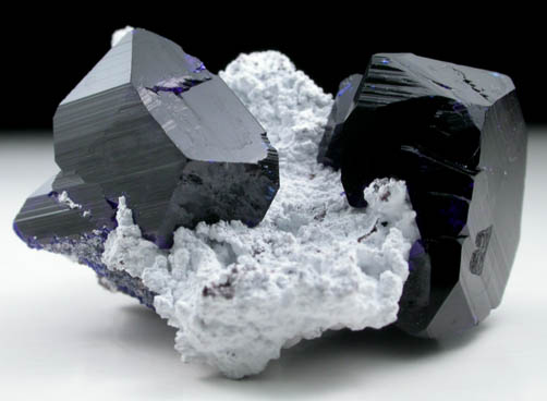 | Description: | Several lustrous blue-black azurite crystals on contrasting white clay. The azurite crystals are sharp and distinct. Two azurite crystals intersected another crystal (now gone) resulting in a contact surfaces on the termination faces. |
