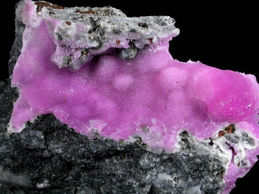 | Description: | Thin layer of 1 mm botryoidal calcite lining several surfaces of gray matrix. Most of the calcite is deep magenta color caused by cobalt impurities (variety cobaltoan calcite). The calcite fluoresces under UV illumination. Collected by John Lawson (1942-2024) and Robert Lawson in May 1987 |