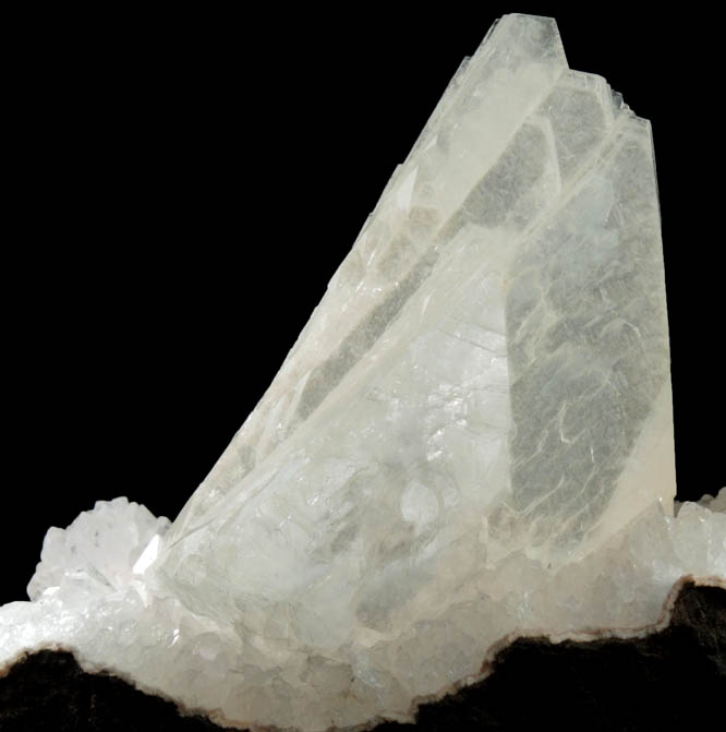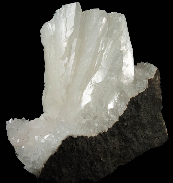 | Description: | Unusually large heulandite crystals standing upright off gray basalt surrounded by lustrous colorless quartz crystals to 5 mm. The heulandite crystals have lustrous faces and show classic pearly luster on the broad {010} faces. |