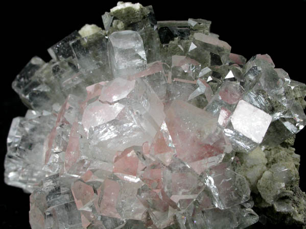 | Description: | Hemispherical formation of elongated lustrous transparent colorless apophyllite crystals to 12 mm over a pink core that is visible beneath the apophyllite. The apophyllite crystals have flat basal pinacoid terminations modified by {111} corner faces. From a one-time find in 2011 |