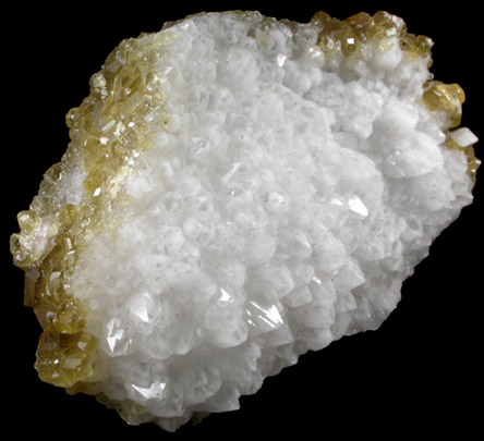 | Description: | Double-sided plate of translucent colorless quartz crystals to 5 mm with lustrous transparent yellow-brown barite crystals to 4 mm overgrown around the outer edge of the quartz. |