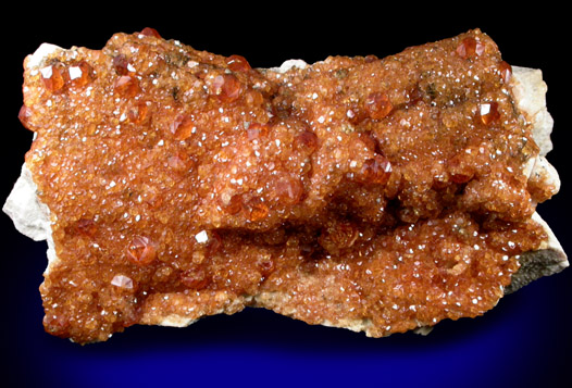 | Description: | Sparkling cluster of lustrous transparent orange spessartine garnet crystals completely coating the front and top edge of light-colored microcline feldspar. The spessartine crystals look beautiful when viewed under magnification. |