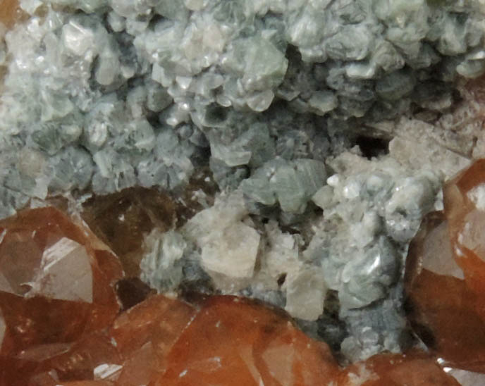 | Description: | Lustrous transparent-to-translucent orange-brown grossular garnet crystals to 7 mm with platy green clinochlore crystals to 1 mm in stacked-shaped aggregates. The grossular garnet crystals are dodecahedral form with fine striations on the crystal faces. |