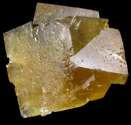 | Description: | Transparent yellow cubic interpenetrant-twinned fluorite crystals with pitted crystal faces where the fluorite grew around another mineral, possibly pyrite, which dissolved away. Ex. John Lawson (1942-2024) and Robert Lawson |