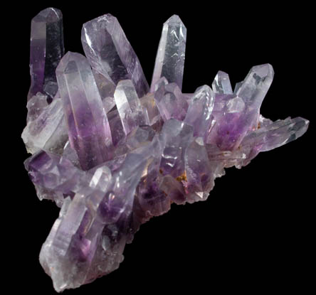 | Description: | Triangular cluster of many intersecting transparent purple amethyst quartz crystals with no matrix. The amethyst crystals have silky luster and have purple color in the lower halves with colorless terminations. Ex. Dr. N. Luppescu |