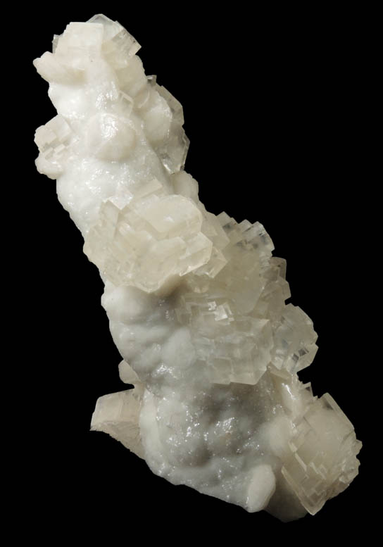 | Description: | Finger-shaped stalactitic formation of translucent white dolomite with partial overgrowth of transparent colorless rhombohedral calcite crystals to 8 mm. The calcite crystals fluoresce orange under SW UV illumination. |