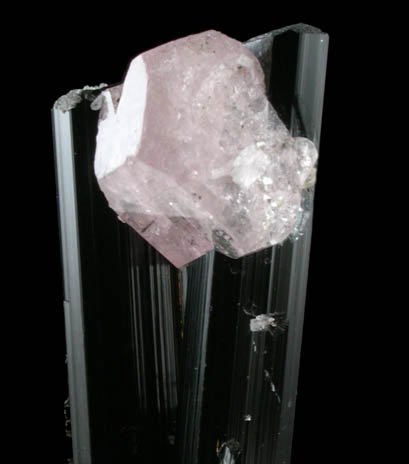 | Description: | Two lustrous black terminated schorl tourmaline crystals to 38 mm long with translucent pink hexagonal fluorapatite crystals to 10 mm on the terminations. The largest fluorapatite crystal has a solution cavity running into the center. |