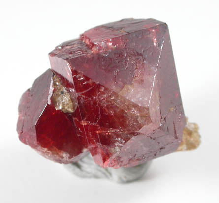 | Description: | Doubly-terminated transparent red zircon crystal with four-sided pyramidal termination and a partial crystal attached on one side. |