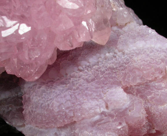 | Description: | Large cluster of translucent pink crystals of rose quartz with lustrous faces on most crystals, but one area has drusy-coated three-faced pseudorhombohedral crystals. The cluster has vivid pink color. Has remnants of glue where it was mounted on a base. |