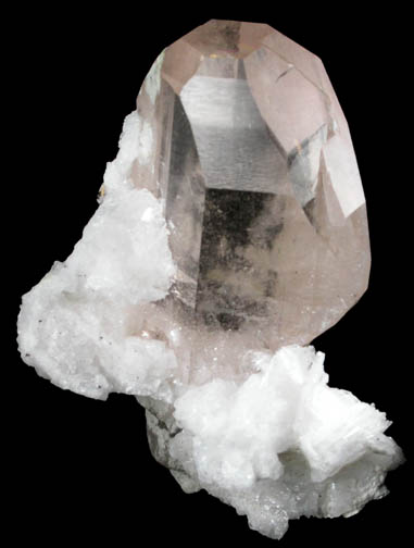 | Description: | Transparent sherry-colored gem topaz crystal 30 mm long with lustrous glassy crystal faces and white albite crystals to 4 mm on the base and rear. The topaz crystal is water clear and has basal pinacoid termination modified by complex secondary faces. |