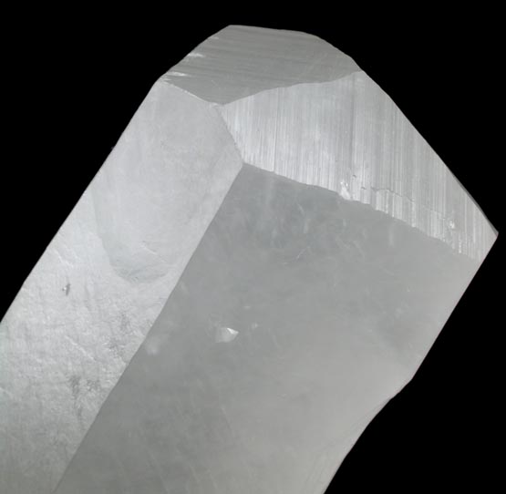 | Description: | Large tapered pseudohexagonal translucent pale-yellow calcite crystal with silky surface luster and three-face rhombohedral termination. The calcite crystal has an impression on the rear where it intersected an adjacent calcite crystal. |