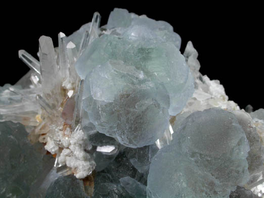 | Description: | Complex transparent blue-green fluorite crystals to 30 mm on colorless quartz with transparent crystals to 18 mm. The fluorite crystals are cubo-octahedral form with surfaces composed of smaller, parallel octahedral crystal faces with waxy luster. |
