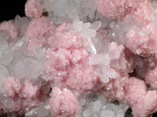 | Description: | Translucent pink rhombohedral rhodochrosite crystals to 1 mm in hemispherical aggregates to 14 mm diameter on translucent colorless quartz crystals to 6 mm with a few yellow-metallic pyrite crystals to 4 mm on the bottom edge. |