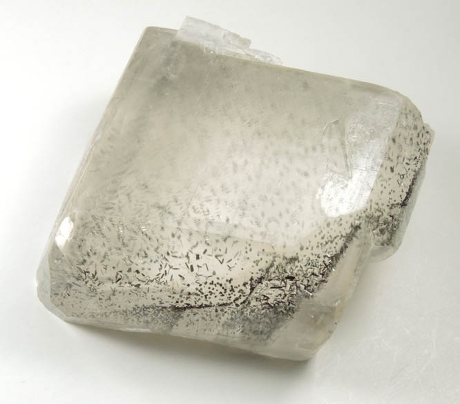 | Description: | Highly transparent rhombohedral calcite partial crystal with yellow-metallic filiform and cubic pyrite crystal inclusions in zoned horizons running through the calcite plus elongated translucent red inclusions of an unidentified mineral (rutile?). |