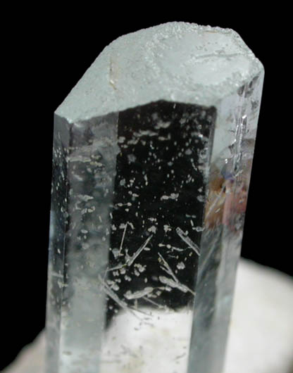 | Description: | Water-clear prismatic beryl crystal on white albite. The beryl crystals is very pale blue color which is too pale to be called aquamarine, but just enough color to prevent being labeled goshenite. |