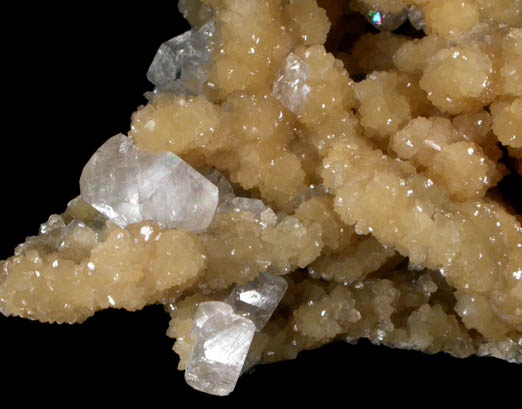 | Description: | Platy groups of lustrous translucent brown stellerite crystals to 3 mm with several lustrous transparent colorless calcite crystals to 16 mm. |