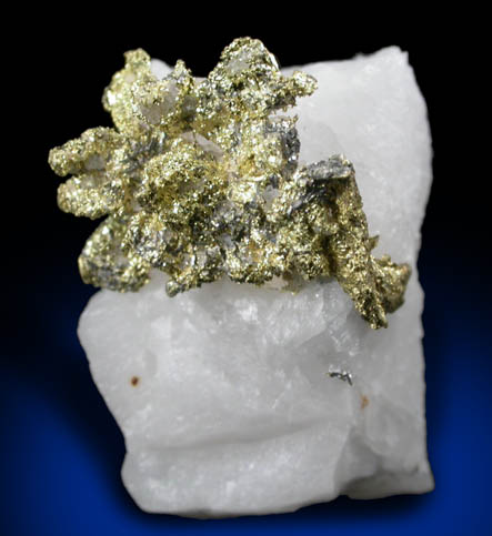 | Description: | Bright yellow-metallic crystallized native gold on the top edge of a fragment milky quartz. The gold crystallized in convoluted sheet formations with microscopic crystal faces on the surfaces. Weight: 3.4 grams including the quartz |