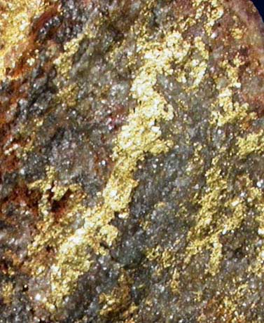 | Description: | Limonite-stained brown matrix with veins of crystallized yellow-metallic gold visible on one face and individual gold crystals scattered throughout the matrix. |
