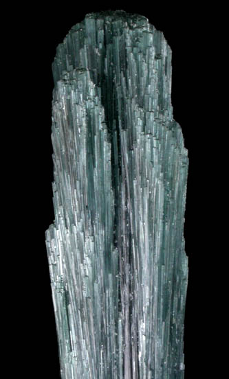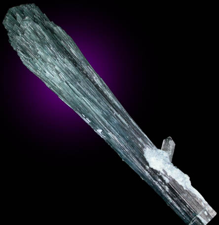 | Description: | Tapered translucent indicolite tourmaline crystal, the blue gem variety of elbaite tourmaline, with complexly striated prism faces the result of many subparallel crystals forming together. When illuminated from the rear show good blue color. |