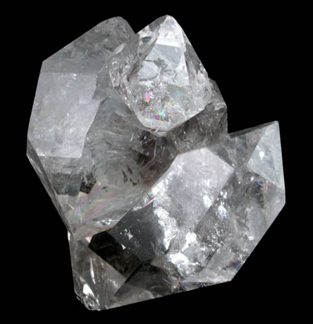 | Description: | Cluster of transparent Herkimer Diamonds, the variety of quartz crystals found in the Herkimer, N.Y. region, with a few minor inclusions of black hydrocarbon, locally known as anthraxolite. Most likely the cluster was restored, though no glue is visible. |