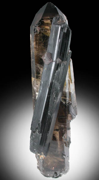 | Description: | Terminated (rare) black prismatic arfvedsonite crystal 41 mm long intergrown into the side of a lustrous doubly-terminated transparent smoky quartz crystal 57 mm long with small brown zircon crystals to 2 mm. Has remnants of glue on bottom. Ex. Thomas A. Penney (1934-2019) collection #418, collected in the 1960s-70s. |