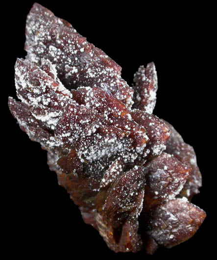 | Description: | Lustrous translucent brown pointed descloizite crystals to 12 mm in subparallel aggregates fully crystallized all around, plus rhombohedral translucent white smithsonite crystals to 0.4 mm on the descloizite faces. Ex. G. Carmichael collection |