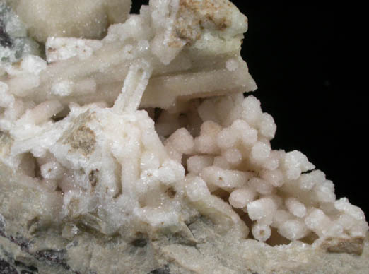 | Description: | Lustrous translucent creme-colored stilbite crystals to 0.5 mm forming epimorphs over acicular natrolite crystals to 20 mm and trapezohedral analcime crystals to 12 mm. Ex. David U. Trevas (1912 - 2007); ex. Sam Weller |