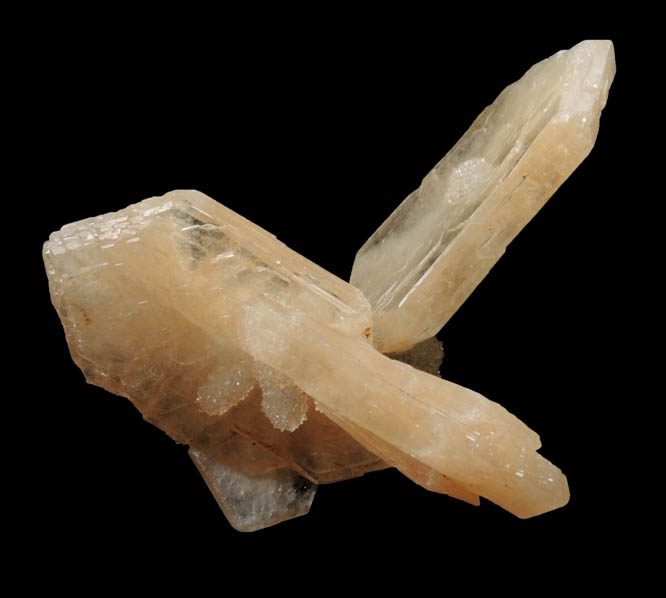 | Description: | Sculptural formation of lustrous doubly-terminated translucent-to-transparent pink-orange stilbite crystals to 30 mm on a convoluted group of druzy quartz crystals to 1 mm. Note the hourglass-shaped internal zoning in the stilbite. |