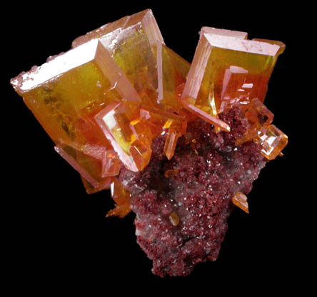 | Description: | Lustrous transparent orange wulfenite crystals with beveled edges on brown limonite-rich matrix. |