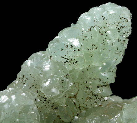 | Description: | Translucent green prehnite pseudomorph after bladed anhydrite crystals to 25 mm with distinct lustrous prehnite crystal faces on all surfaces. Ex. Hobart Jones collection |