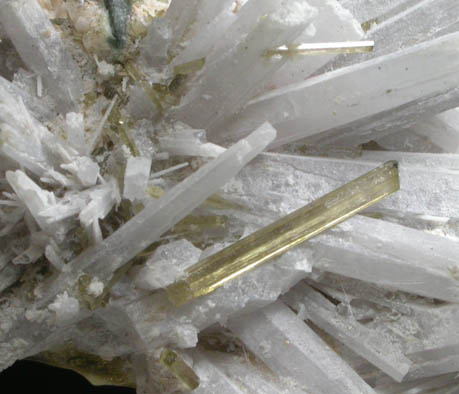 | Description: | Translucent gray anhydrite crystals to 20 mm with transparent green prismatic crystals of an unknown mineral, tentatively listed as epidote on the label. Ex. A. Stevenson (1916-2007) collection #2200 |