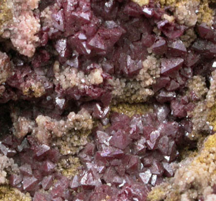 | Description: | Translucent dark-red octahedral cuprite crystals lining a shallow cavity in earthy brown matrix. Ex. A. Stevenson (1916-2007) collection |