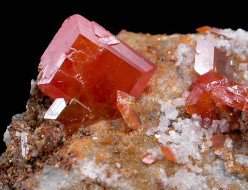 | Description: | Lustrous translucent red-orange wulfenite crystals to 10 mm on translucent greenish fluorite with translucent white calcite crystals to 0.5 mm. The fluorite fluoresces purple under UV illumination, the calcite fluoresces white. One crystal is incomplete. |