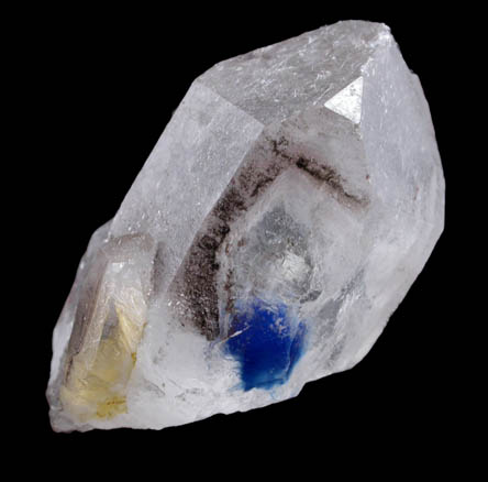 | Description: | Translucent gray 30 mm quartz crystal with a spherical rosette 5 mm diameter of acicular deep-blue papagoite crystals included within the quartz. |