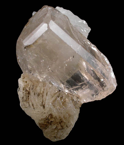 | Description: | Lustrous transparent (nearly flawless) sherry-colored topaz crystal with flat basal pinacoid termination with secondary and tertiary faces around the termination edges. Platy albite and milky quartz surround the topaz crystal. |